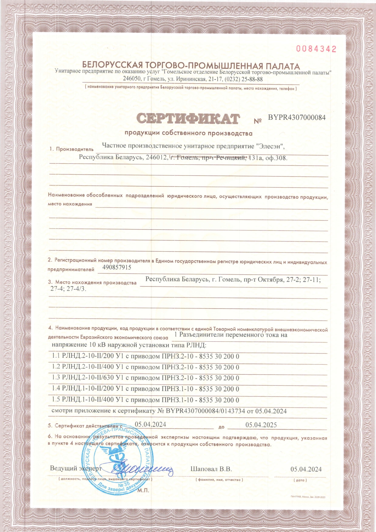 Данный Сертификат подтверждает, что разъединители переменного тока на напряжение 10кВ наружной установки типа РЛНД является продукцией собственного производства Подробнее