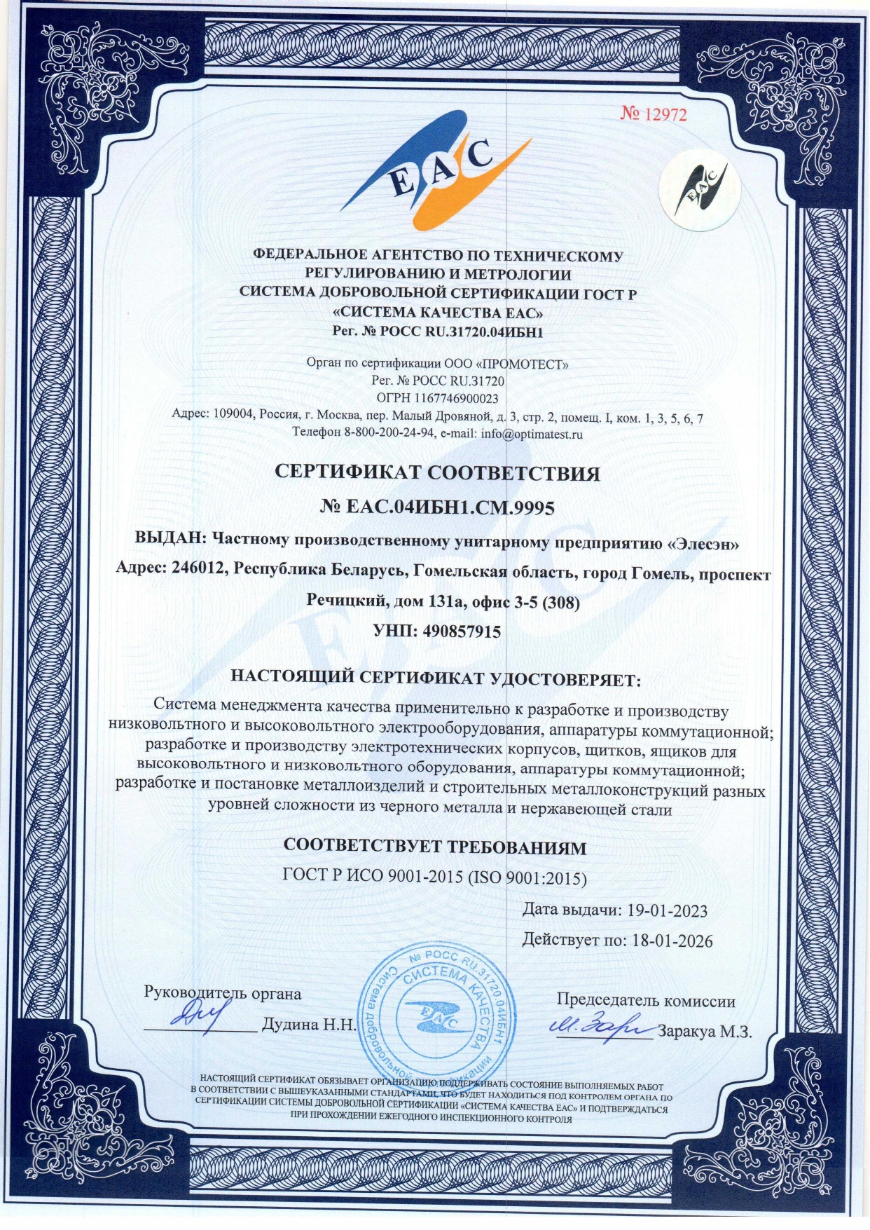 Данный Сертификат подтверждает, что система менеджмента качества применительно к разработке и производству низковольтного и высоковольтного электрооборудования, аппаратуры коммутационной; разработке и производству электро-технических корпусов, щитков, ящиков для высоковольтного и низковольтн... Подробнее
